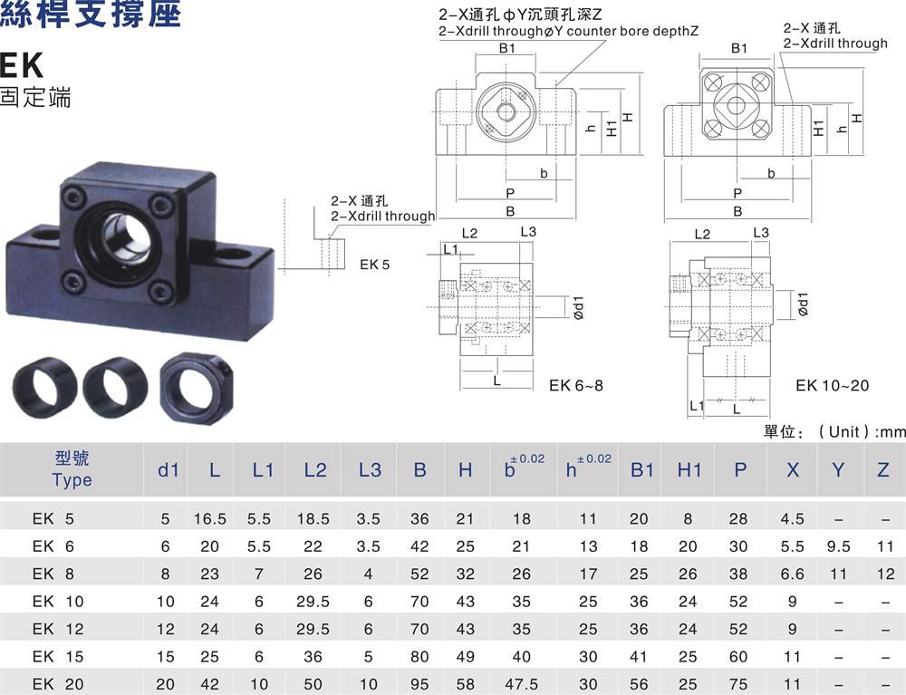 EK絲桿支撐座簡單的來講是連接絲桿和電機的軸承固定底座,是正確的標準滾珠螺桿軸端成品,同時預備了四種種標準化的支撐單元:EK型、EF型和BK型、BF型。支撐單元固定側的裝有經過預壓調整的JIS5級的角接觸球軸承,很多都是小型的,特別是在EK6、EK8兩種超小型式中,則裝有為超小型滾珠螺桿所開發設計的接觸角45°(45度)的超小型角接觸球軸承,為了能獲得高精度、高剛性并且穩定自如的回轉性能,同時支撐座的支撐單元也使用了深溝球軸承,支撐單元BK型、EK型的內部軸承中裝入了適當的鋰皂基潤滑脂,不易過多,用特殊密封墊圈進行密封,可以長期使用,也能直接安裝。