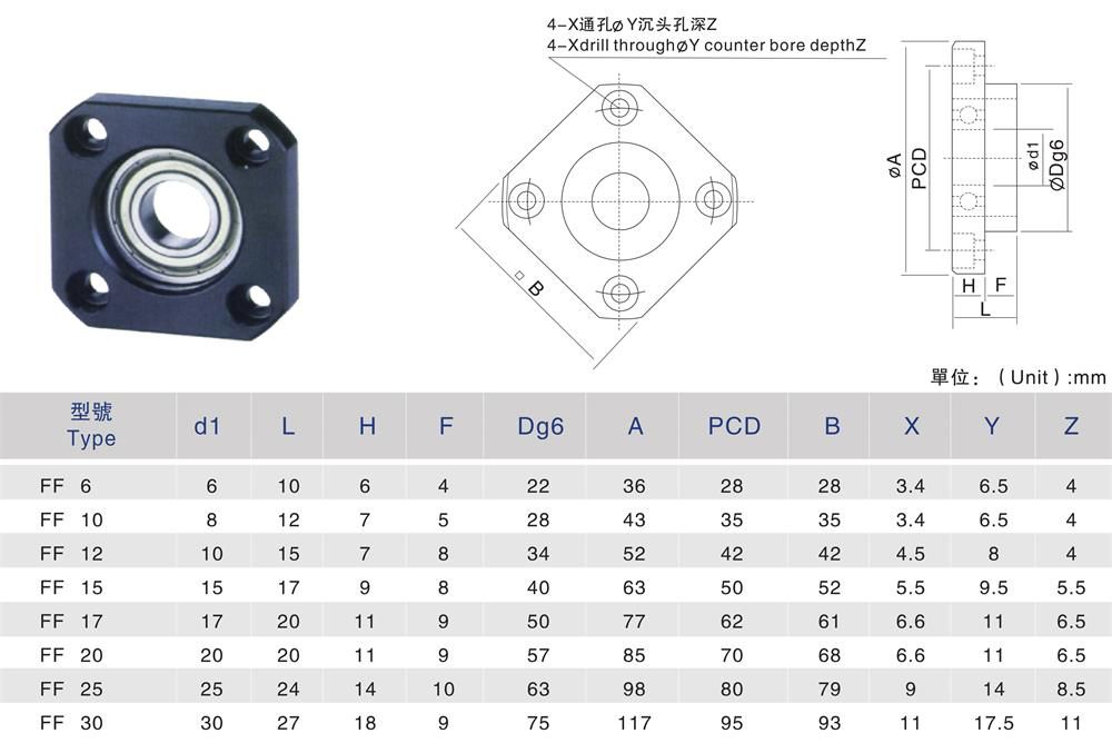 FF絲桿支撐座簡單的來講是連接絲桿和電機的軸承固定底座,是正確的標準滾珠螺桿軸端成品,同時預備了四種種標準化的支撐單元:EK型、EF型和BK型、BF型。支撐單元固定側的裝有經過預壓調整的JIS5級的角接觸球軸承,很多都是小型的,特別是在EK6、EK8兩種超小型式中,則裝有為超小型滾珠螺桿所開發設計的接觸角45°(45度)的超小型角接觸球軸承,為了能獲得高精度、高剛性并且穩定自如的回轉性能,同時支撐座的支撐單元也使用了深溝球軸承,支撐單元BK型、EK型的內部軸承中裝入了適當的鋰皂基潤滑脂,不易過多,用特殊密封墊圈進行密封,可以長期使用,也能直接安裝。