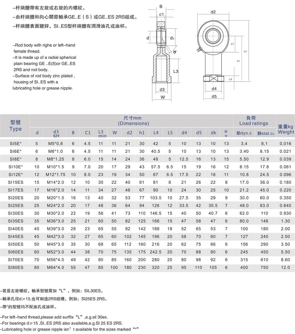 SI-E/SI-ES桿端關節軸承是一種有著特殊結構組成的滑動式軸承,它的結構相對比較簡單,滾動軸承要復雜一點,其主要是由一個有內球面的外圈和一個有外球面的內圈組成,根據其不同的類型和結構,在工作中能承受較大的負荷,也可以承受徑向負荷、軸向負荷、軸向同時存在的聯合負荷模式。